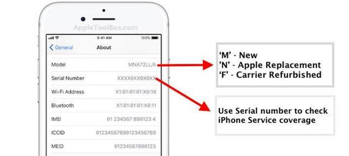 Model Numberأو رقم النموذج وهو ما نريد معرفته فإذا كان هذا الرقم يبدأ بحرف M فهذا معناه أن الهاتف جديد، أما إذا كان يبدأ بحرف N فهذا يعني أن الهاتف مُستبدل (أي أنه كان به عطل وتم ارجاعه لأبل وتم اصلاحه واعادة بيعه، وأخيراً إذا كان يبدأ بحرف F فهذا يعني أن هذا الهاتف تم تجديده أو إعادة تجميعه، إذاً لا بُد أن تتأكد بأن هذا الرقم يبدأ بحرف M.