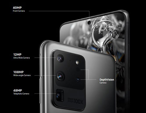كاميرا هاتف سامسونج جالكسي S20 ألترا الخلفية مكونة من أربعة كاميرات كالآتي:- كاميرا أساسية بدقة 108 ميجابكسل بتقنية دمج البكسلات لدمج كل 9 بكسلات في بكسل واحد لإنتاج صورة عالية الجودة حتى في ظروف الإضاءة المنخفضة بدقة 12 ميجابكسل. تدعم أيضاً التثبيت البصري OIS وفتحة عدسة F/1.8.
