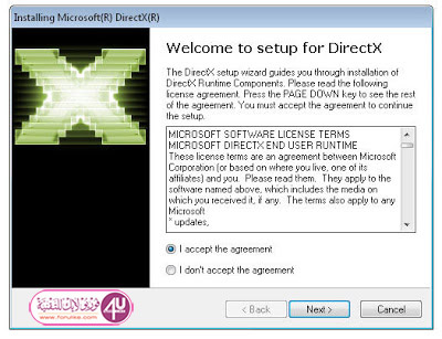 برنامج directX 9 من هنا، وفك الضغط عنه وابدأ بتثبيته وأعد تشغيل الجهاز وإذا لم تتم حل المشكلة فقم بتحميل