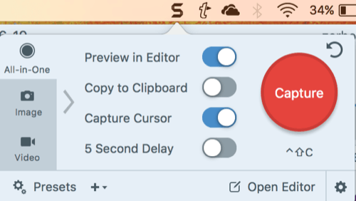 من أجل البدء في تصوير الشاشة، نضغط على Capture في أعلى اليسار أو يمكننا الضغط على الأيقونة الخاصة بالبرنامج في الشريط العلوي: