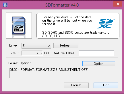 Drive هو يشير الى الترتيب الذى اخدته الفلاش ميمورى على الحاسوب Size ويشير الى حجم الفلاشة وهنا 7.19 اى ليست بالحجم الكامل اى هناك جزء مفقود. Volume Label ويشير الى اسم الفلاش ميمورى Optionn اى المسئول عن اعدادات الفورمات هنا.