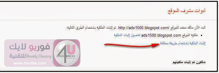 ولاستخراج شفرة تحقق جوجل :اذهب إلى صفحة مشرفي المواقعثم ادخل على المدونة التي سجلتها في مشرفي المواقع وإن لم تكن سجلت من قبل عليك بالتسجيل في موقع مشرفي المواقعوإضافة مدونتكواتبع الشرح كما بالصور التالية