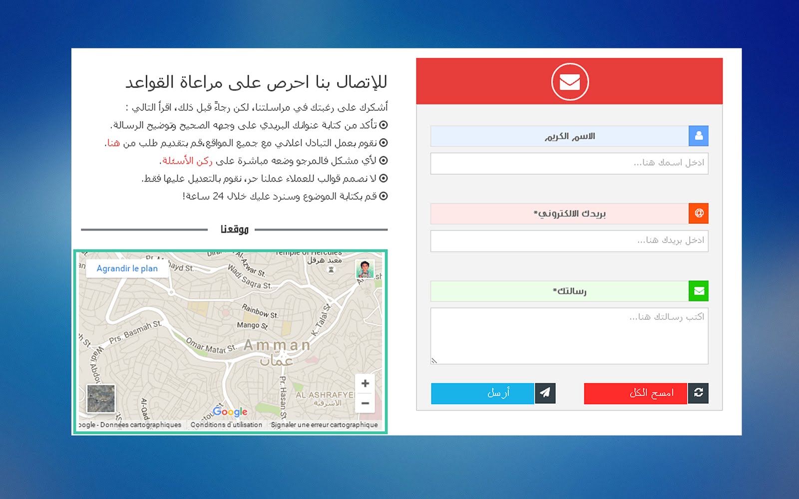 https://www.google.com/maps/embed?pb=!1m14!1m8!1m3!1d1692.7191199026654!2d35.9229038!3d31.9490057!3m2!1i1024!2i768!4f13.1!3m3!1m2!1s0x151b5f83601a3e29%3A0xfff765b46de974b9%26amp%3Boutput%3Dembed!2sThe+Rainbow+Art+House+Theater!5e0!3m2!1sar!2sjo!4v1453415074531" style="border: 0;" width="100% <form name="contact-form"> الاسم الكريم <input class="contact-form-name animated wow flipInY delay-02s animated" id="ContactForm1_contact-form-name" name="name" placeholder="ادخل اسمك هنا..." size="30" style="visibility: visible;" type="text" value="" /> بريدك الالكتروني* <input class="contact-form-email animated wow flipInY delay-04s animated" id="ContactForm1_contact-form-email" name="email" placeholder="ادخل بريدك هنا..." size="30" style="visibility: visible;" type="text" value="" /> رسالتك* <textarea class="contact-form-email-message animated wow flipInY delay-06s animated" cols="25" id="ContactForm1_contact-form-email-message" name="email-message" placeholder="اكتب رسالتك هنا..." rows="5" style="visibility: visible;"></textarea> <input class="contact-form-button contact-form-button-submit" id="ContactForm1_contact-form-submit" type="button" value="أرسل" /> <input class="contact-form-button contact-form-button-submit clear-button" type="reset" value="امسح الكل" /> </form> <style> i.fa.fa-home { position: absolute; top: 156px; color: #Fff; left: 940px; } #google-map { width:442px; height:260px; border:4px solid #44C6A9; margin-bottom:10px; } .topwrapper ,#Header-wrapper ,#comments ,#sidebar-wrap {display:none;} [class*="col-"] {width:100%;} body {background-image:url