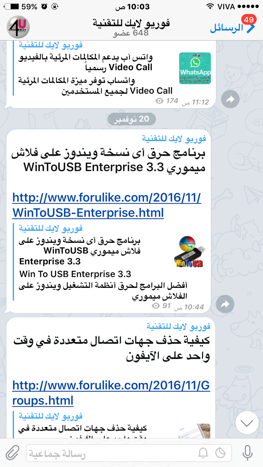 وهي ميزة جديدة ورائعة تُمكنك من إنشاء قناة خاصة بكأو بمنظمتك للتواصل مع الجمهور أياً كان عدده “طبعاً لا نقصد بقول قناة أي قناة مرئية، بل نقصد قناة كتابية”. ومن أبرز فوائد هذه الميزة التالي: - يمكنك إنشاء قناة خاصة بك أو بمنظمتك تمتلك رابط خاص بها مثل رابط قناة فوريو لايك للتقنية: http://telegram.me/forulike، ويمكنك نشر هذا الرابط لكل من تريده أن يشترك في قناتك، وبمجرد أن يقوم الشخص بالنقر عليه سينتقل مباشرة إلى القناة ليشترك فيها في حال كان محملاً التطبيق في جهازه مسبقاً.
