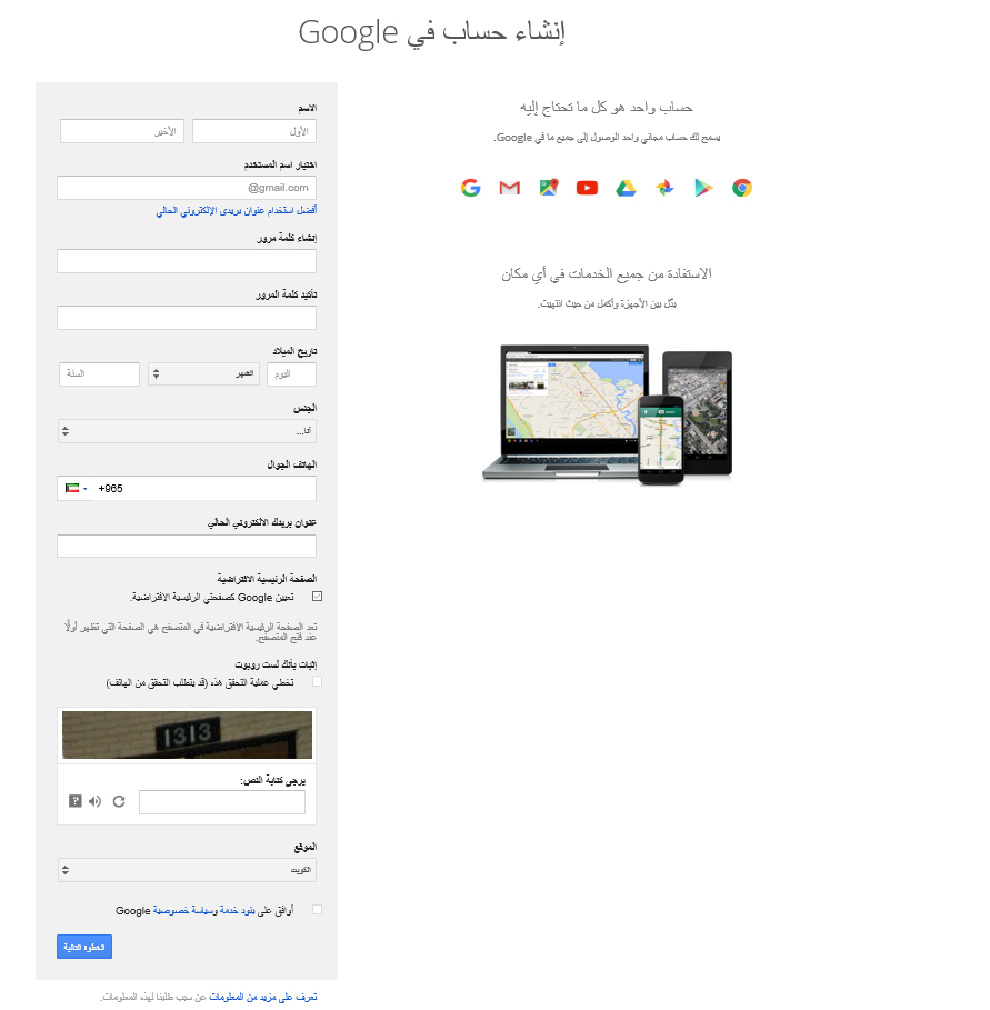 حساب جوجل أصبح شيء ضروري وأساسي أن يمتلكه كل شخص يستخدم الانترنت وتطبيقات جوجل وكل من يمتلك جهاز أندرويد لابد وأن يمتلك حساب على جوجل (جيميل) حتى يمكنه تسجيل جهازه وتحميل التطبيقات والبرامج من سوق بلاي، كما لابد من امتلاكك حساب جيميل لتستطيع حماية جهازك الأندرويد واستخدام تطبيقات جوجل المختلفة والعديدة مثل اليوتيوب، خرائط جوجل، بلوجر، جوجل درايف وعمل باك آب لبياناتك وملفاتك على جوجل بالإضافة إلى بريدك الإلكتروني والعديد من منتجات جوجل الهامة والمفيدة.<a name=\'more\'></a>لذلك أعرض لكم في هذا الموضوع شرح لطريقة انشاء حساب أو ايميل جديد على جوجل Gmail بخطوات صحيحة وسهلة ليتسنى لك الاستفادة من جميع منتجات وتطبيقات جوجل.وفي هذا الدرس عرض لطريقة التسجيل باستخدام جهاز الكمبيوتر، وفي موضوع قادم بإذن الله سقوم بعمل شرح لخطوات انشاء حساب جوجل (جيميل) جديد باستخدام الهاتف للأشخاص الذين لا يملكوا جهاز كمبيوتر.