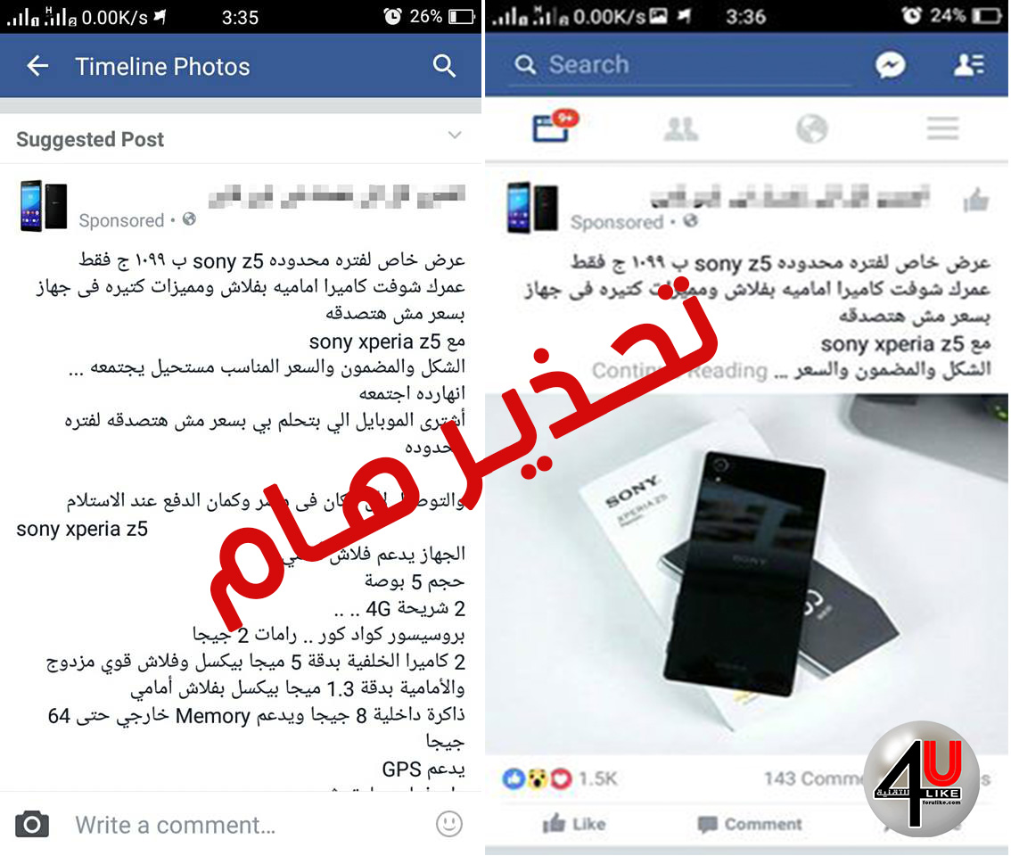 انتشرت في الآونة الأخيره صفحات كتيرة وإعلانات مدفوعة على مواقع التواصل الاجتماعي وعلى بعض القنوات التلفزيونية الغير قانونية أيضا تعرض أجهزة وهواتف للبيع بأسعار غريبة جدا وغير منطقية بالمقارنة بأسعار هذه الأجهزة الفعلية بالأسواق ...على سبيل المثال لو شاهدنا الإعلان الموجود بالصورة المرفقة سنلاحظ أن صاحب الإعلان يعرض جهاز Sony Z5 بسعر 1099 جنيه مصري أي ما يعادل 100دولار أمريكي تقريبا ولا يوجد كلمة واحدة بالإعلان توضح أن الجهاز هاي كوبي ( تقليد وغير اصلي )