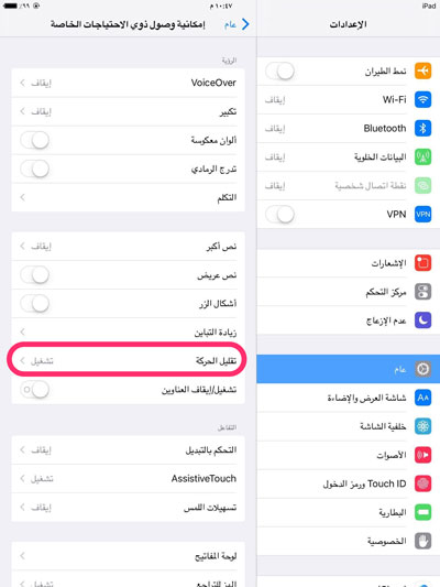الخطوة الثانية:تفعيل خاصية تقليل الحركة:إن كنت تستخدم الأيفون 5 وما بعده وجهاز الآيباد 4 وما بعده، فإن النظام سيكون أثقل لأنه يحوي ميزة الرسوميات الحركية التي تزيد من جماله مثل التأثيرات على الخلفيات وبعض مؤثرات الحركة الأخرى، وهي تستهلك قدرا من طاقة البطارية، بالإضافة إلى آداء المعالج (البروسيسور) نوعا ما، لكن آبل توفر لكم خيارا لإيقاف هذه الحركات الرسومية، كل ما عليك هو القيام بالتالي: